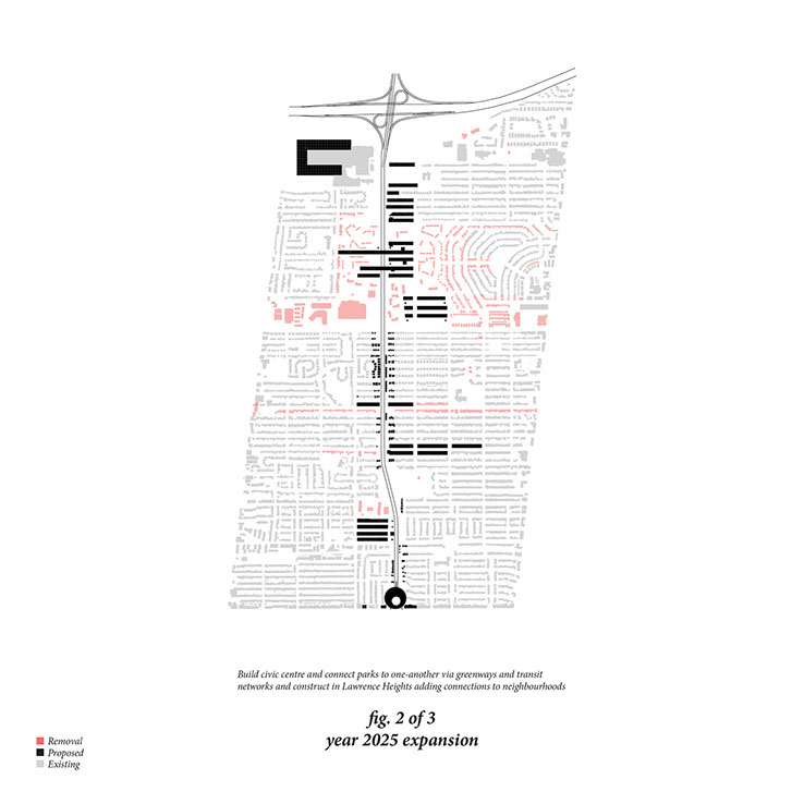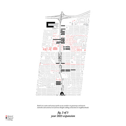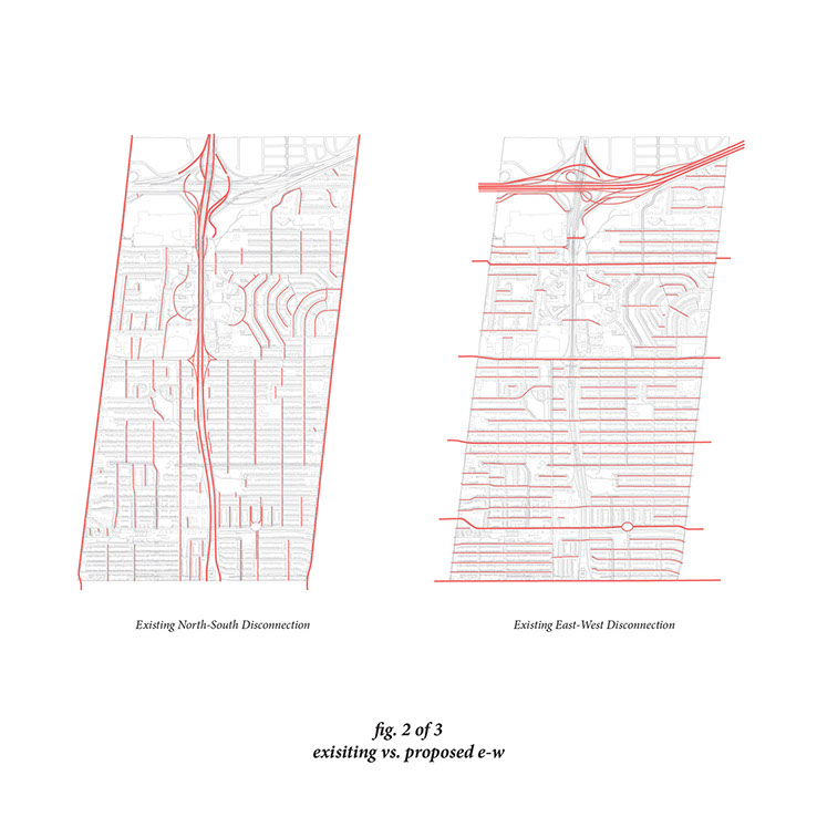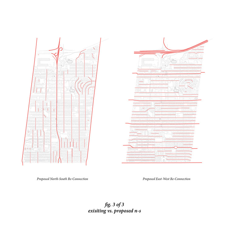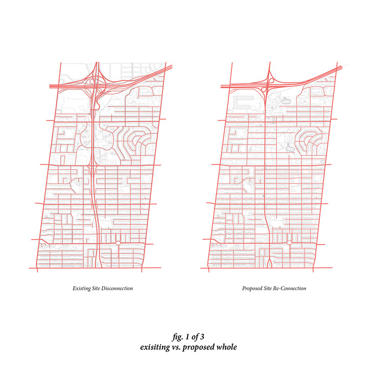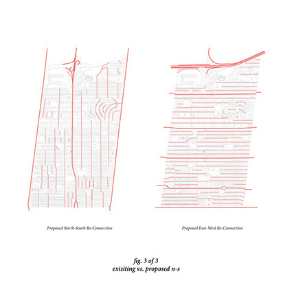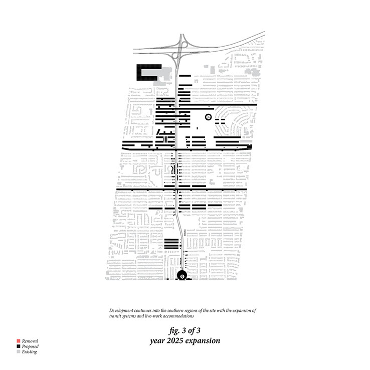 Plus-Minus Y forms the base to expand into the evolving and contemporary city. Allen Road is a place of extreme chaos, relentless noise, and hard edges. These edges split the site down the middle of Allen with a deep sunken highway with bridges that attempt to link both sides.