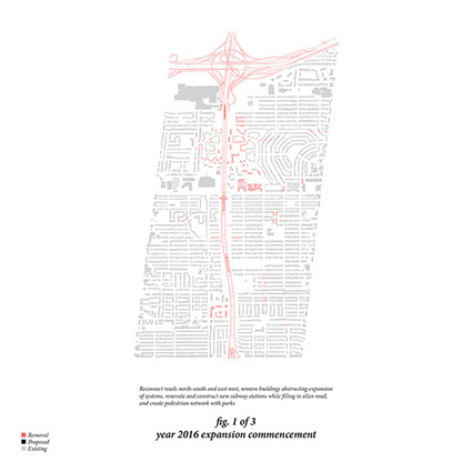 An attempt to reduce segregation, the Allen was turned into a surface road which covers the subway allowing it to expand. This alleviates the need for bridging creating a more natural edge condition providing a more impactful cross relationship.