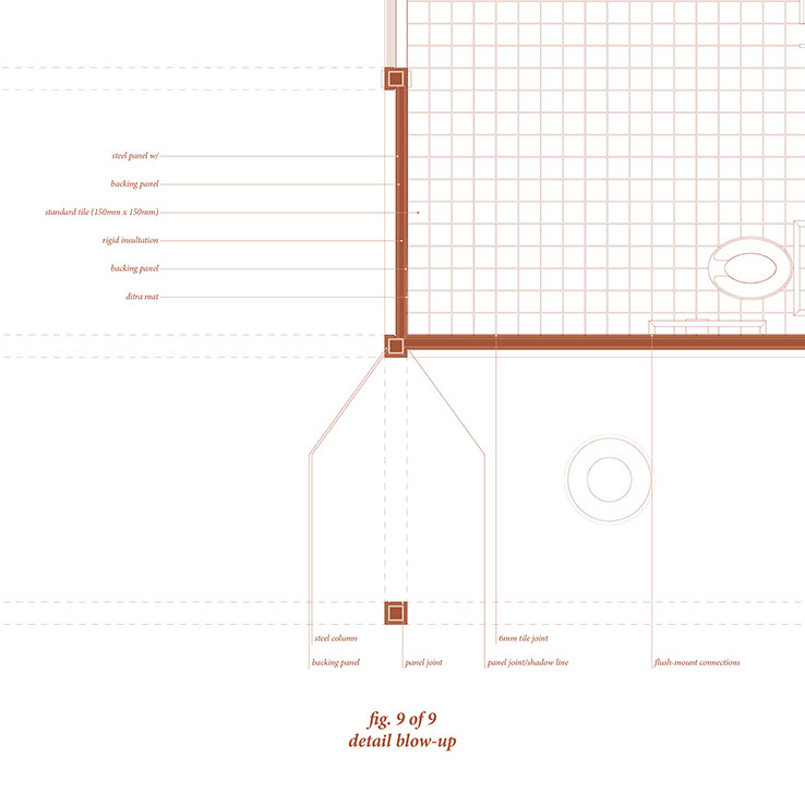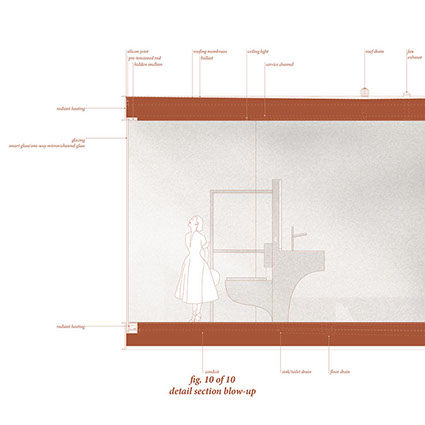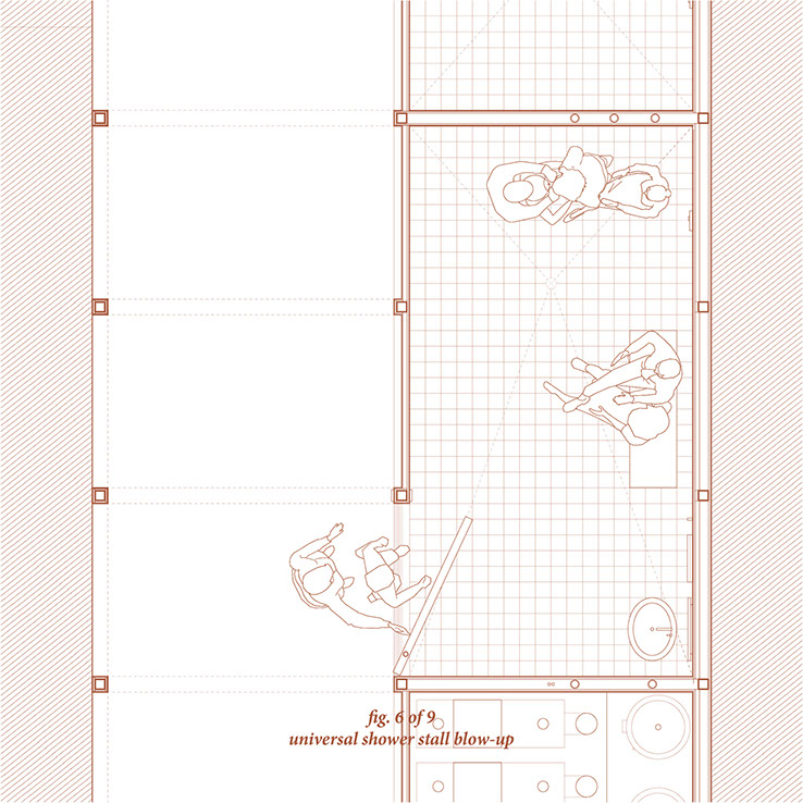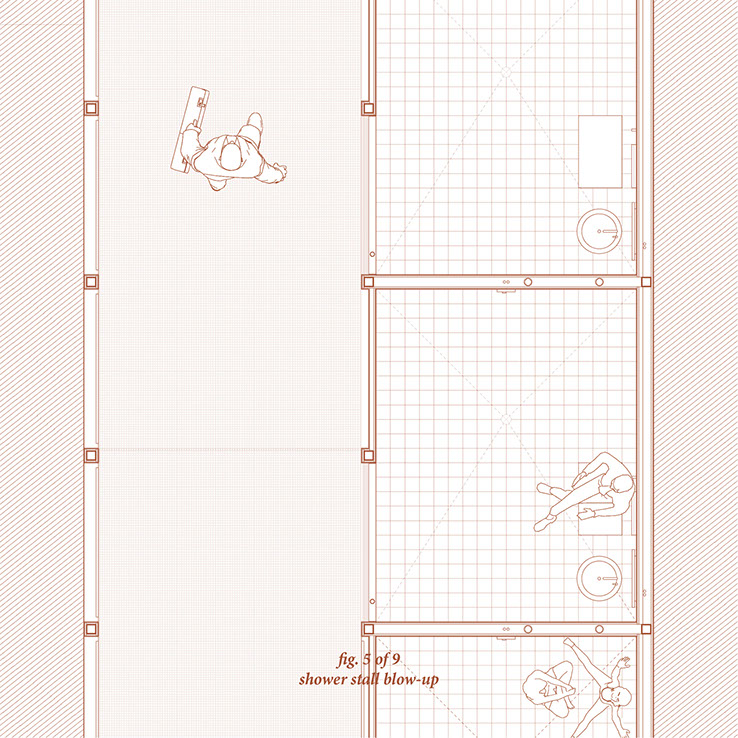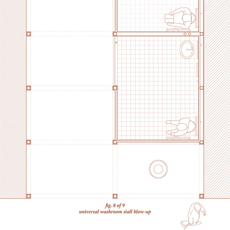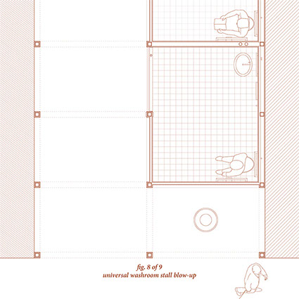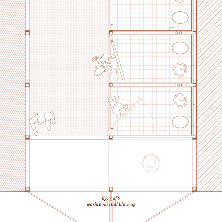 The internal components and spacial constructs of the washrooms utilize aspects of code to create and question the function of these spaces.