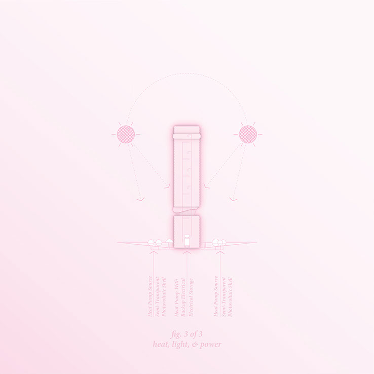 Water balls provide heat and energy through heat pumps and semi-transparent photovoltaics.