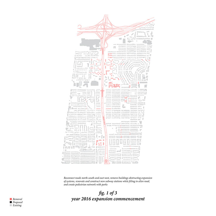 Plus-Minus Y forms the base to expand into the evolving and contemporary city. Allen Road is a place of extreme chaos, relentless noise, and hard edges. These edges split the site down the middle of Allen with a deep sunken highway with bridges that attempt to link both sides.